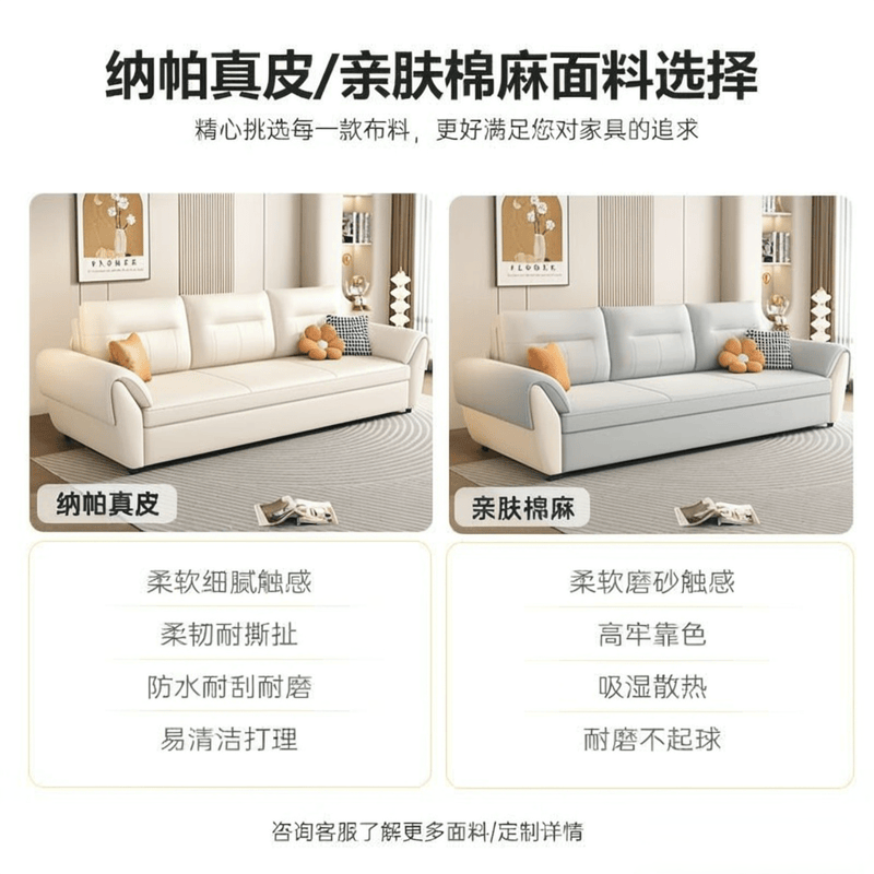 多种选择,个性定制:这沙发不是千篇一律的,有抗菌猫抓布和肤感棉麻面料两种可选,满足你对舒适度的不同追求。还有,靠包是SAPQ弹公仔棉填充的,回弹性好,又软又弹,就像抱了个棉花糖,真的超级舒服!